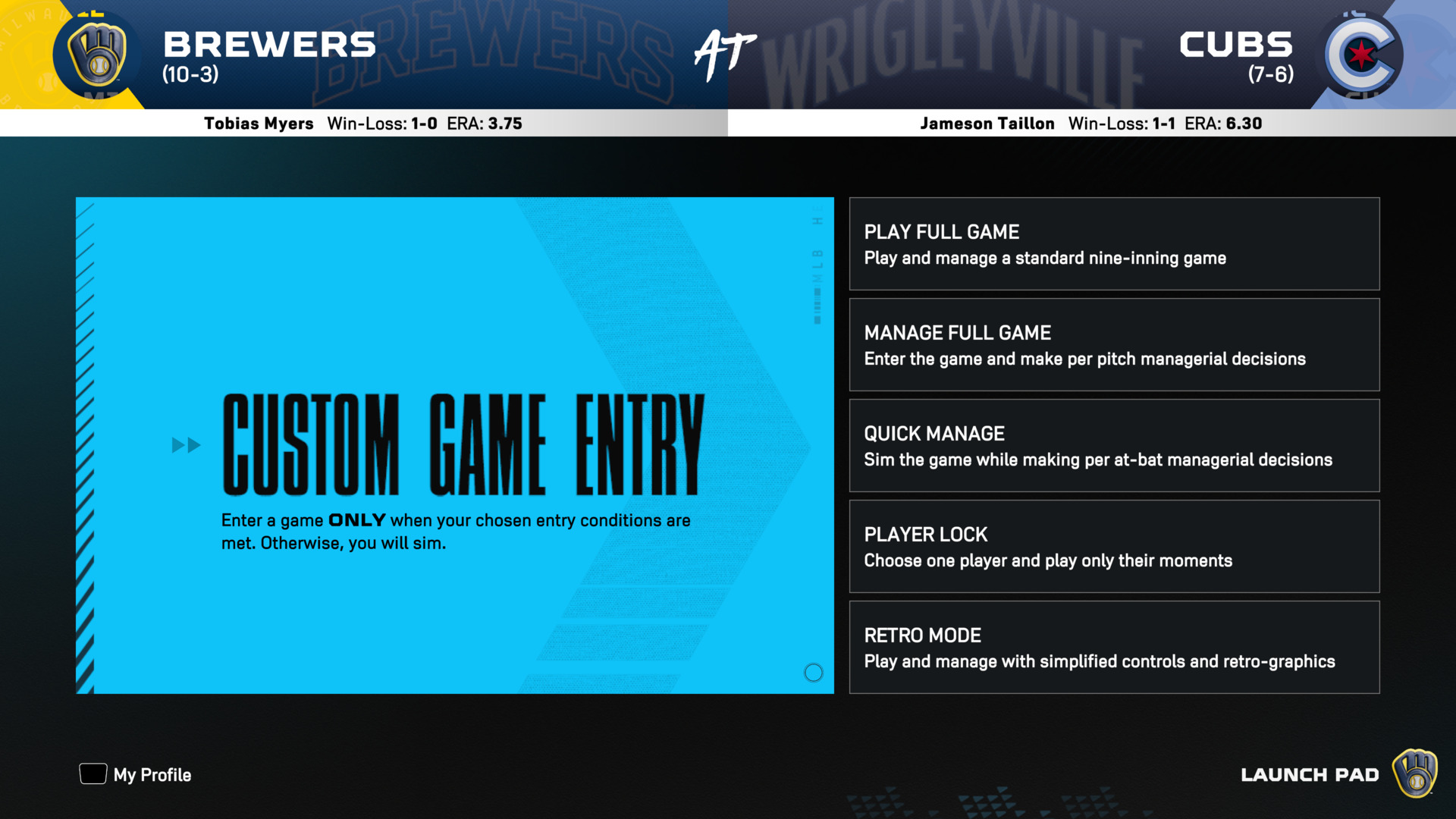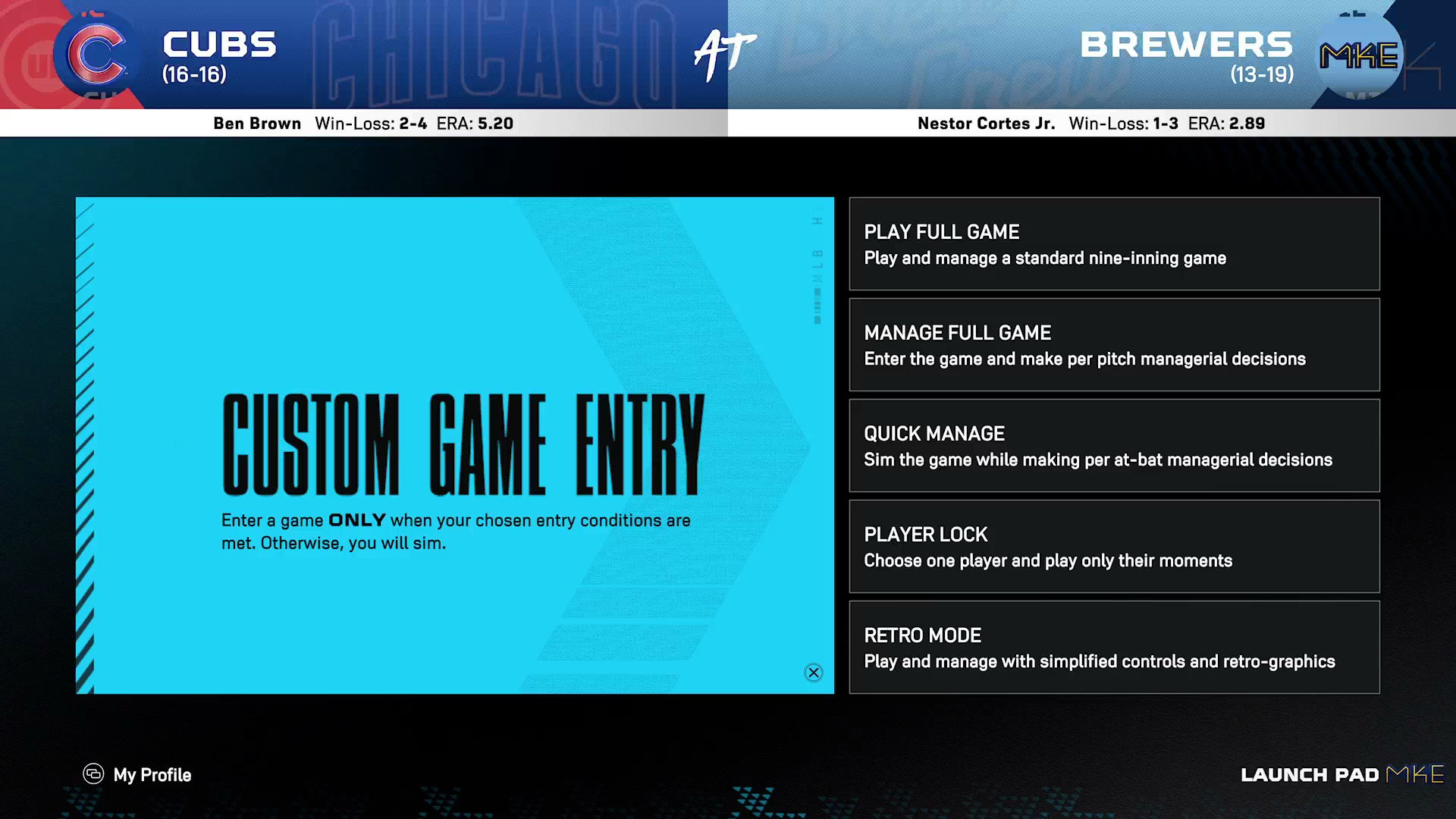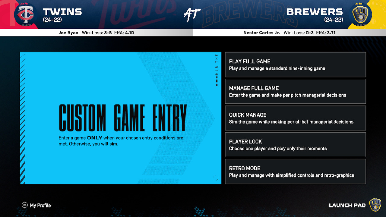 Custom Game Entry lets you enter a critically close game, as determined by you. Use a set of parameters to determine when you jump into play—late, close games, player milestones, anything close in the 5th inning, it’s all up to you!
